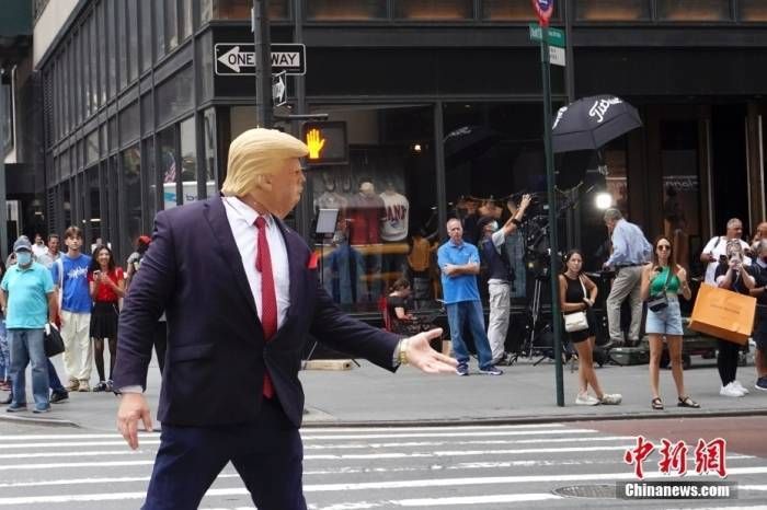 資料圖:當地時間8月10日,一名戴著面具的示威者在美國紐約特朗普大廈外模仿美國前總統(tǒng)特朗普。近兩日,特朗普大廈前示威者、記者、圍觀民眾等人流聚集。 中新社記者 廖攀 攝
